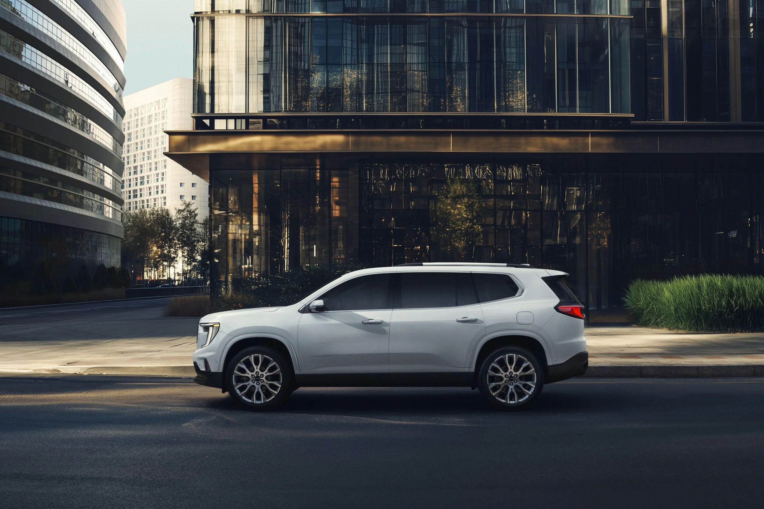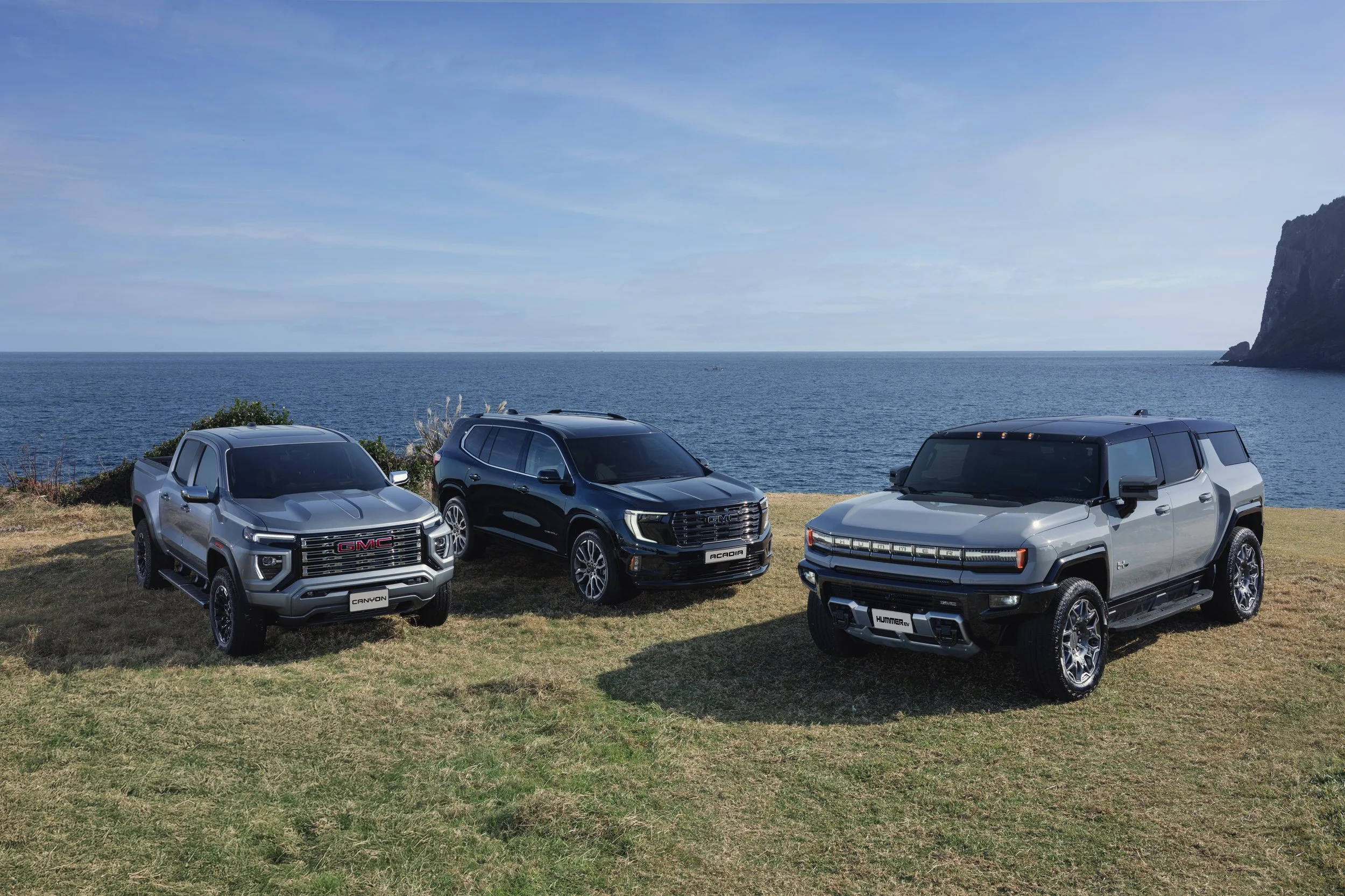 A location-based visual campaign featuring three GMC models across Jeju Island.