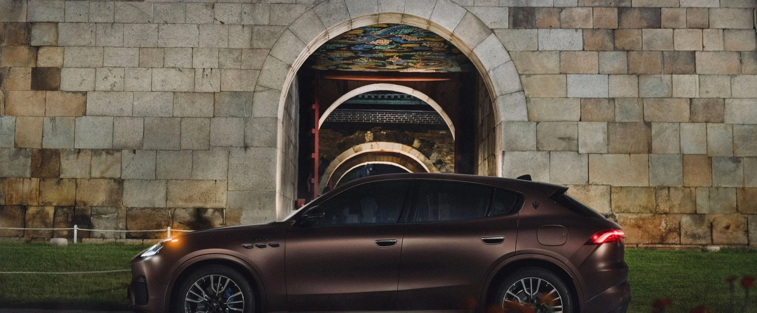 Maserati's new SUV, the Grecale, accompanied us on a long-distance journey. with its matte bronze color shimmering subtly, captured attention wherever it went. It blended with the rainy city lights and reflected the warm hues of the sunset. The sleek design and matte color combination created an abstract reflection, giving it a mysterious image. As we crossed the abundant mountains and traversed the lush roads, we could truly experience the grand touring qualities of the long-distance traveler. The photo aims to depict striking imagery.
